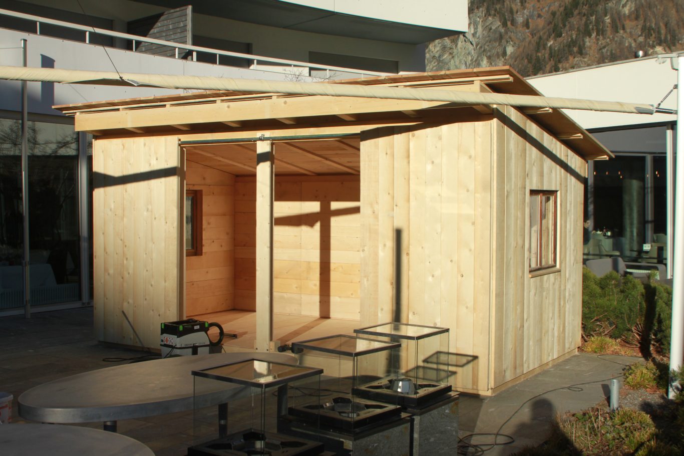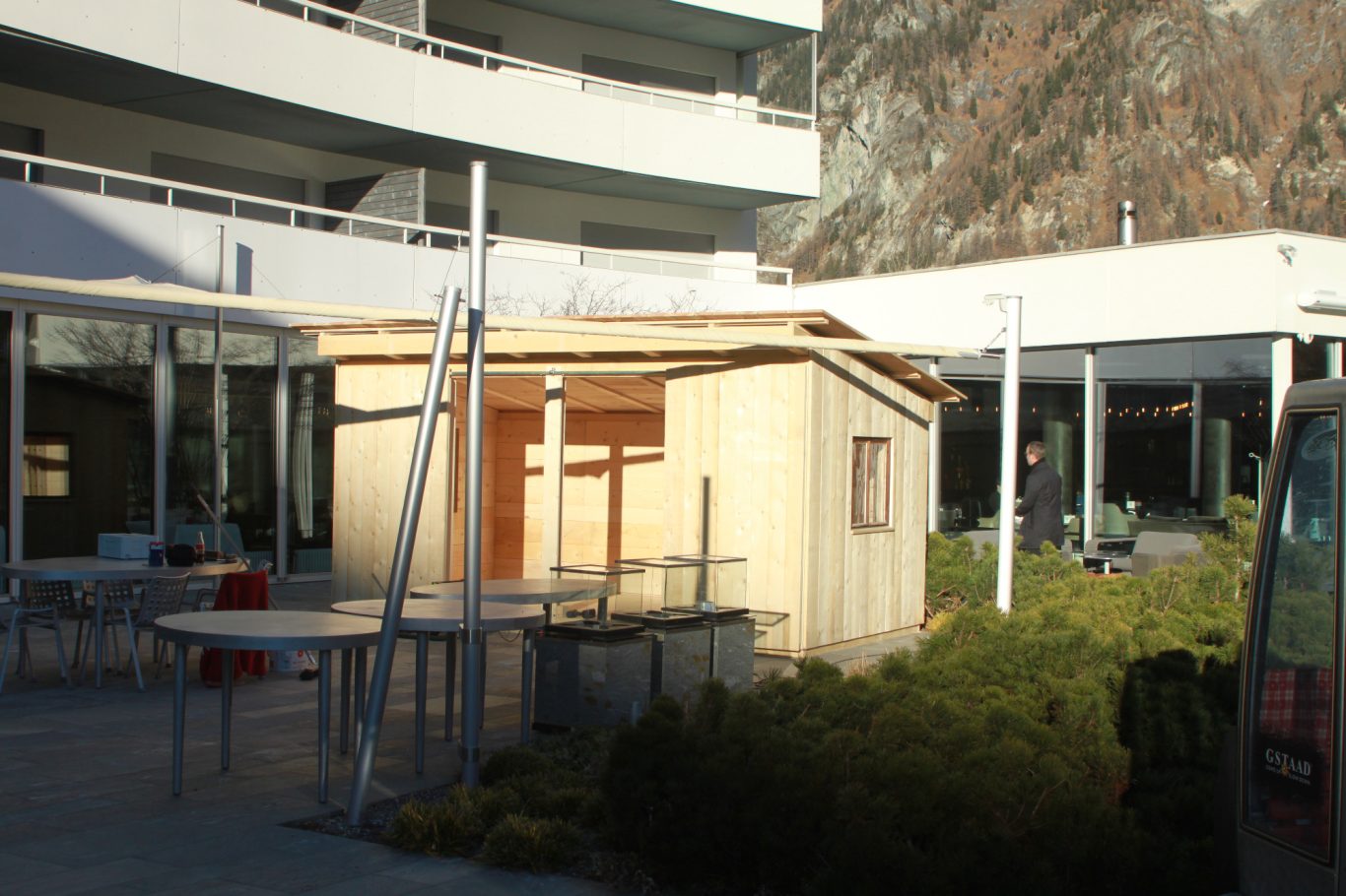 In diesem Häuschen wurde den Gästen im Winter Fondue und andere Leckereien aufgetischt.