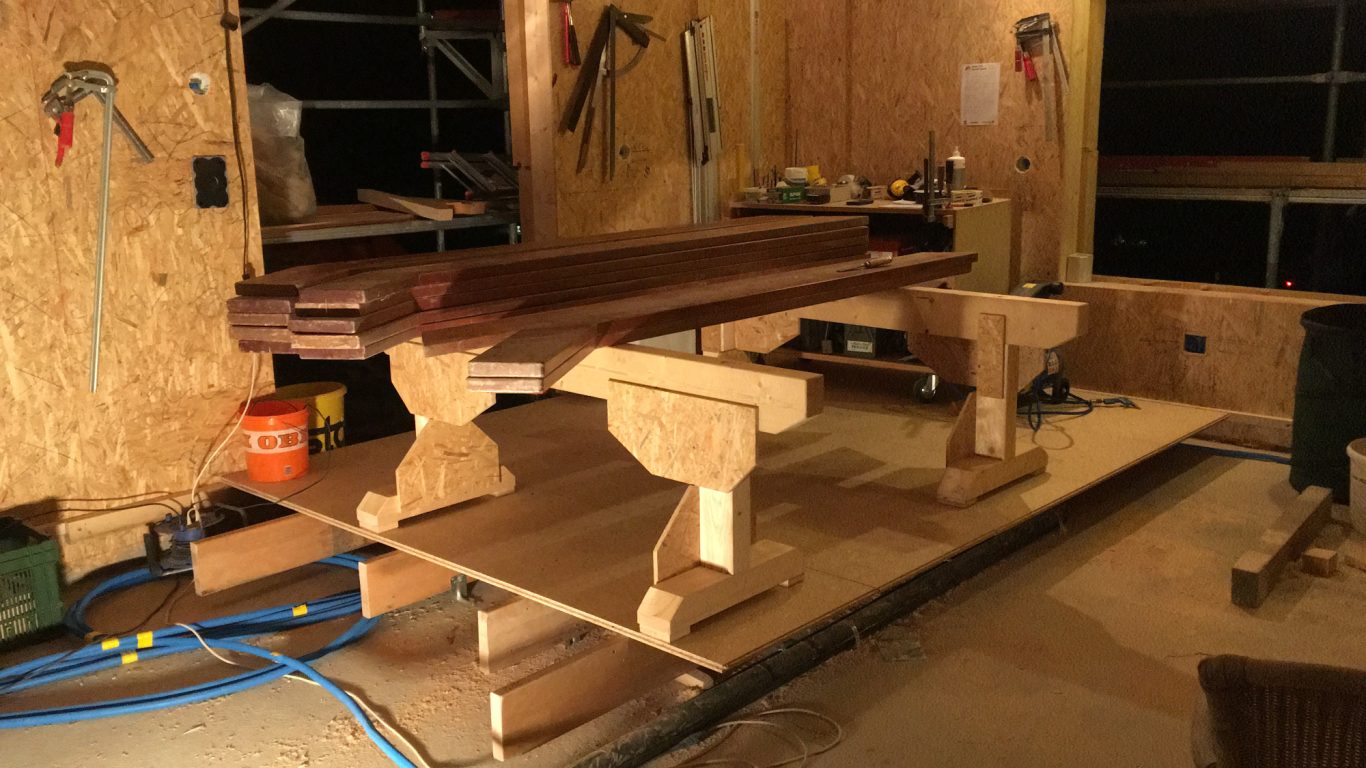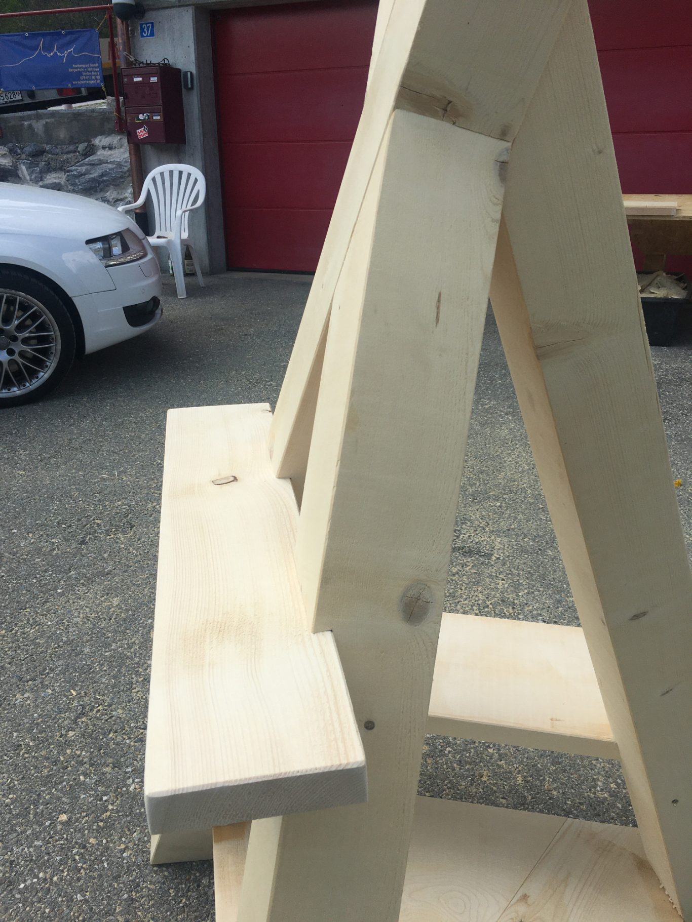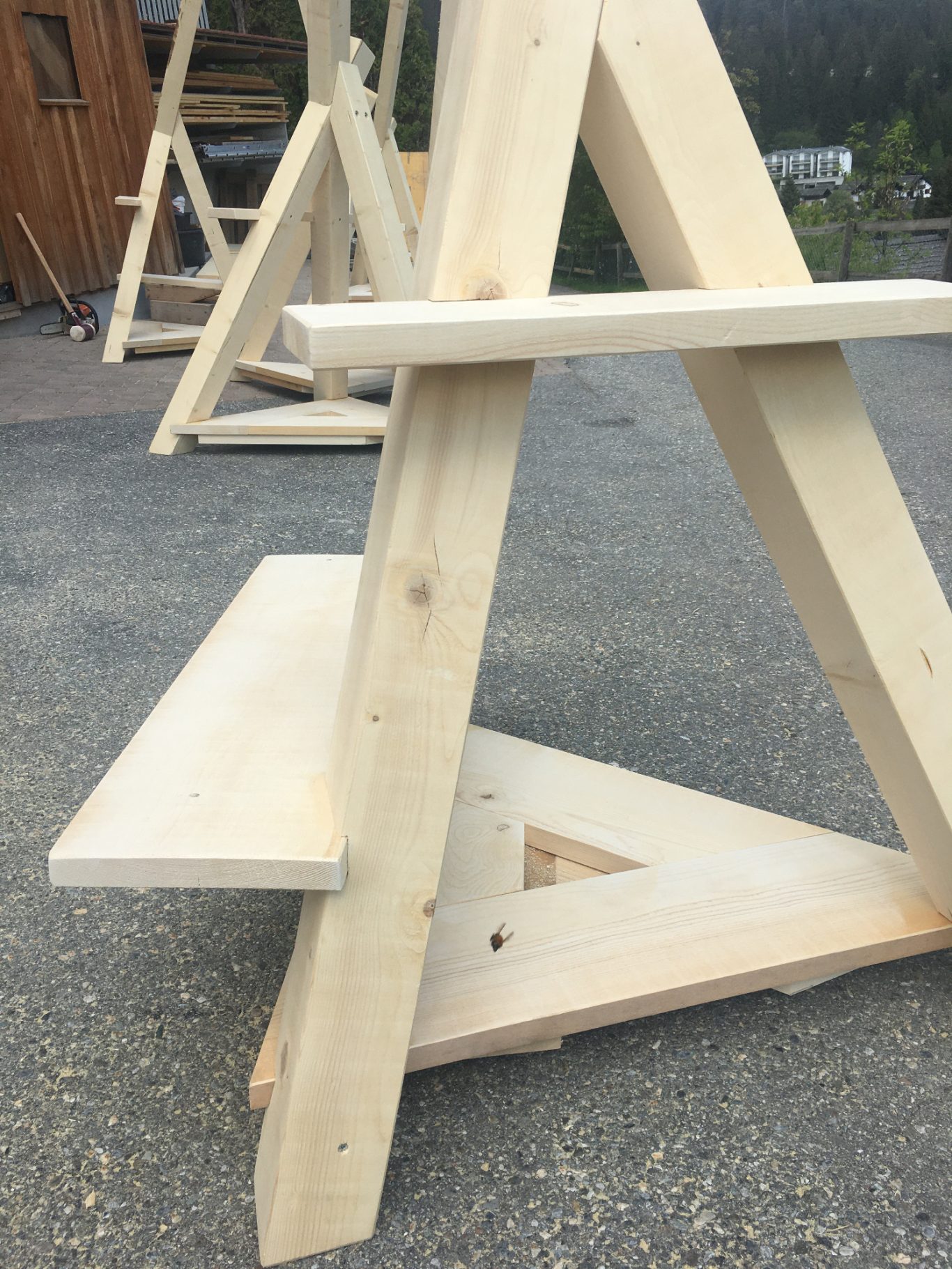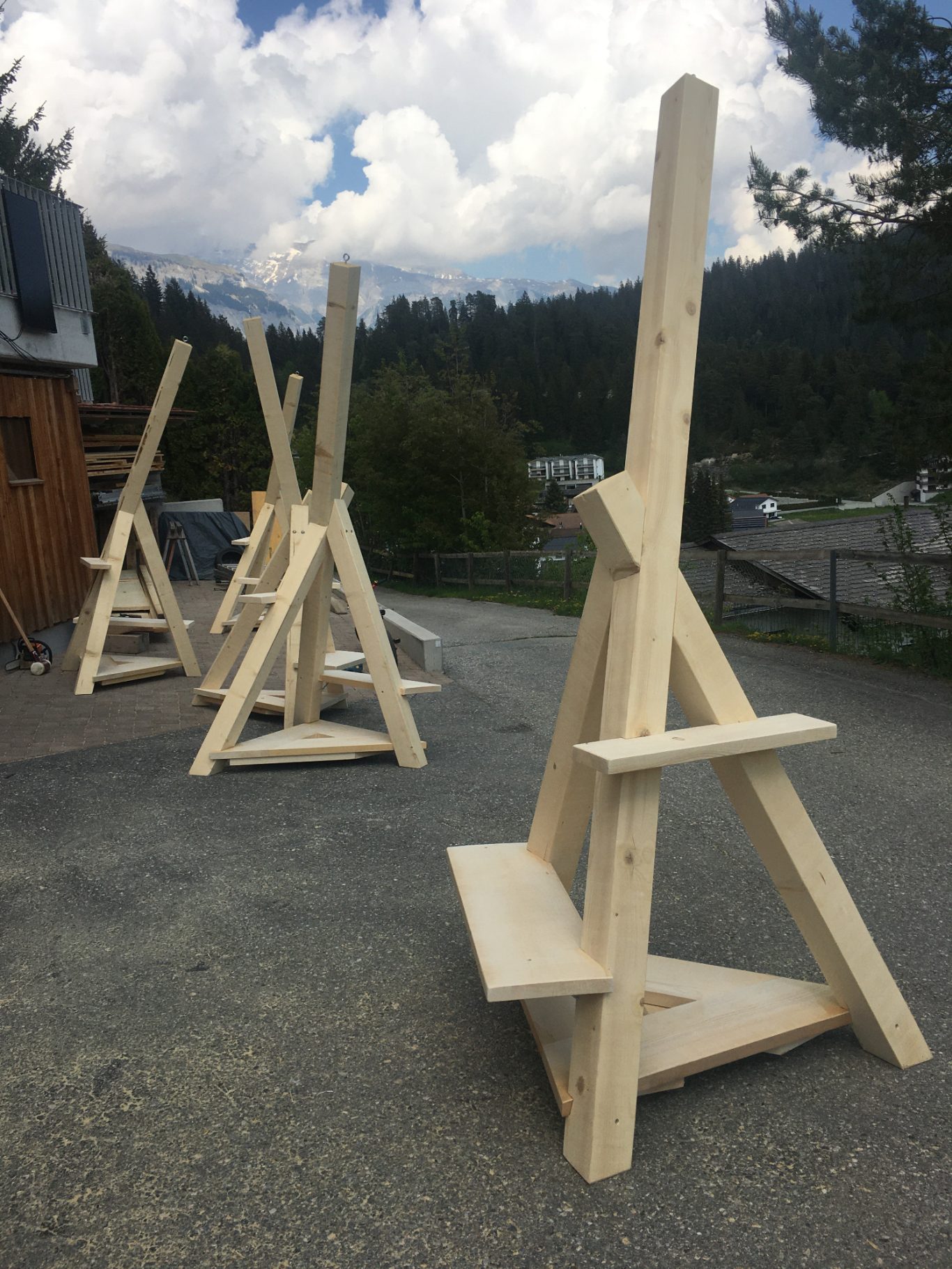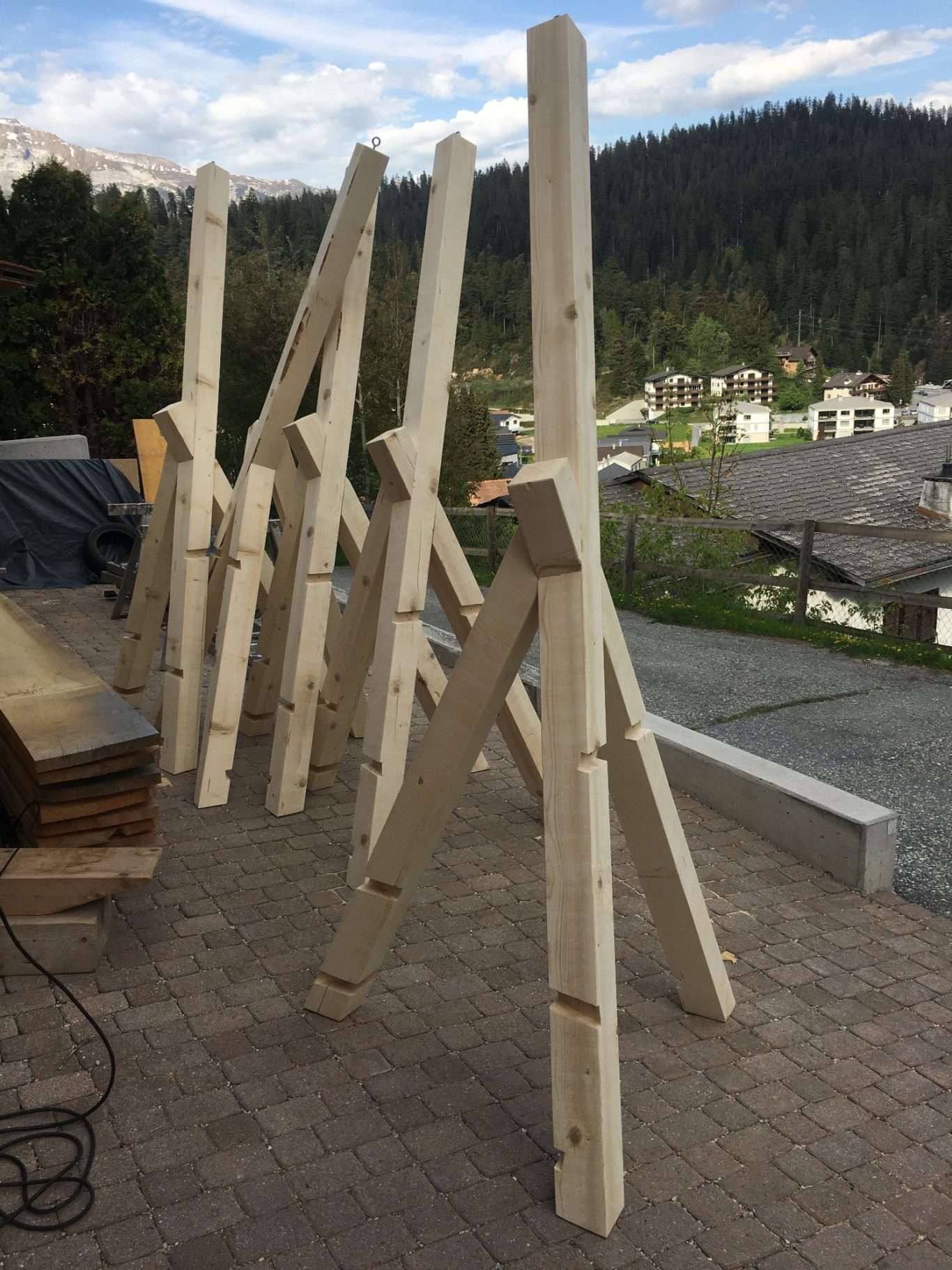 Diese Dreibeine werden benutzt, um im Aussenbereich einen gemütlichen Bereich mit Lichterketten zu gestalten. Sie dienen als Bänkchen und Stehtisch.